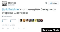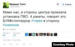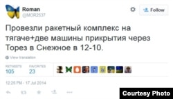 Многие твиты, касающиеся "Бука" (или по меньшей мере крупной единицы боевой техники, которая могла быть "Буком"), были сделаны пользователем @666_mancer. Этот популярный юзер, вероятно, лично не видел описываемые им события, но собирал свидетельства очевидцев с других аккаунтов и делал их перепост у себя. Таким же образом действовал и юзер @WowihaY, который больше не живет в Торезе, но собирает свидетельства местных жителей. Размещение информации о передвижениях сил сепаратистов на собственном аккаунте в соцсетях может быть небезопасным для очевидца, но вполне приемлемым для анонимного юзера или человека, не живущего непосредственно на месте событий. Кроме того, в этих твитах неоднократно используется хэштэг #Stopterror (#Стоптеррор), предназначенный для информирования украинских военных о перемещениях сепаратистов, т.е. речь идет о сборе разведывательной информации местными жителями.