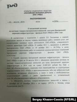 Распоряжение с фамилией, но без подписи вице-президента РЖД Александра Целько: