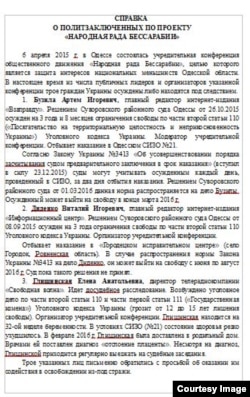 Еще один интересный документ в переписке – это документ под названием "Справка о политзаключенных по проекту «Народная Рада Бессарабии»". Список "политзаключенных" появляется в почте помощника Путина 29 апреля 2015 года и состоит их 4 человек. Двое из них – пророссийские активисты Елена Глищинская и Виталий Диденко – позже были обменяны на арестованных в России украинцев Геннадия Афанасьева и Юрия Солошенко.