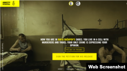 Впрочем, так и есть: это 360-градусное видео – виртуальный проект, созданный правозащитной организацией Amnesty International совместно с чешскими разработчиками. Но оно не без сходства с жизнью: покончить с виртуальным заключением и дождаться отмены приговора в этой нереальности тоже непросто. Нажав на кнопку "Выйти из тюрьмы", получаешь единственный ответ: "Выйти из российской тюрьмы не так-то просто".