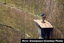 В рамках этой кампании активисты также надели импровизированный противогаз на памятник Чижику-Пыжику в Санкт-Петербурге: