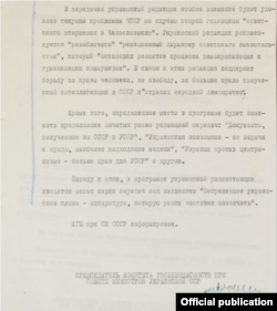 В последнем документе архива, от января 1991 года, говорится о скором приезде на Украину директора радиостанции "Свобода" с целью открыть в Киеве и Львове корпункты. Авторы донесения советуют не создавать РС режим благоприятствования.