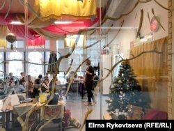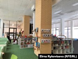 А это сама библиотека. Там под елочкой сидели взрослые девочки и мастерили, как они нам объяснили, интерактивную гирлянду с фотографиями своего класса.