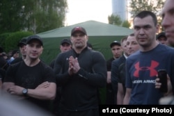 Рядом с Миняйло в сквере все время находился человек в черной кепке с большим крестом в руках, который, как кажется на этом фото, вот вот заплачет. Радио Свобода удалось идентифицировать "крестоносца" как Игоря Пыжьянова, председателя спортивно-патриотического отдела Екатеринбургской епархии. Как и "титушки", которые появились в сквере чуть позже, он близок к силовым видам спорта: из описания на сайте епархии следует, что 40-летний Пыжьянов был многократным абсолютным чемпионом Урала по армрестлингу и руководил спортивным клубом "Русский силомер". В своем отделе, который он возглавляет с 2004 года, Пыжьянов организовывал, в числе прочего, "Ежегодную легкоатлетическую эстафету "Царский беговой марафон" в честь дня рождения святого страстотерпца Царя Николая II", спортивно-патриотический турнир "Силовой экстрим" и "спортивно-патриотические соревнования" среди осужденных колоний под названием "Три часа свободы". Максим Миняйло ушел с акции протеста вечером 13 мая, однако Пыжьянов на ней остался и до поздней ночи позировал фотографам с иконой в руках.