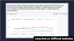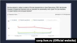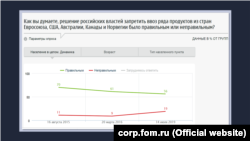 Михаил Соколов: Результаты довольно любопытные. Сейчас считают это решение правильным 56%, было 70%. 11% считают неправильным – было, стало 19%. Растет, но в общем большинство одобряет такую политику правительства. Я подозреваю, что это связано в значительной степени и с пропагандой.