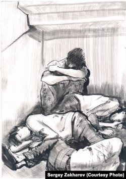 Сергей Захаров провел в заключении у сепаратистов полтора месяца. И на рисунках, которые легли в основу повествования, рассказывается о том, что он пережил. Бесконечные избиения, пытки, когда задыхаешься от недостатка воздуха в не приспособленном для содержания пленников тесном помещении, имитации расстрелов. Вот что он пишет об этом в своей книге: