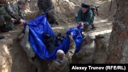 Вместе с поднятыми останками, которые, по словам поисковиков, должны отправить на экспертизу, в раскопках нашли предмет, похожий на пуговицу, а также гильзы от пуль.