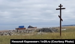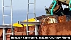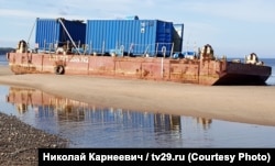 Утром 2 сентября информационное агентство "Беломорканал" опубликовало видео, снятое 31 августа рядом с двумя понтонами, оказавшимися у берега Двинского залива рядом с селом Нёнокса после взрыва на морском полигоне ВМФ. На видео показан замер радиационного фона, и его уровень рядом с понтонами существенно превышает допустимый. Сегодня Радио Свобода впервые публикует фотографии понтонов в высоком разрешении: на одном из них мы обнаружили подъемный кран, дизель-генератор, а главное – небольшой желтый контейнер для транспортировки опасных радиоактивных отходов.