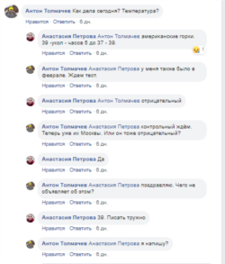 Последняя запись в ее фейсбуке датирована этим же днем. 26 марта в 13:13 она написала: "Первый тест на корону – отрицательный". Под тем же постом можно прочитать комментарий, датированный 29 марта. У нее спрашивают, как тест на коронавирус, она отвечает, что он отрицательный. А на вопрос, почему она не объявляет об этом, Анастасия отвечает, что ей трудно писать, а температура держится.