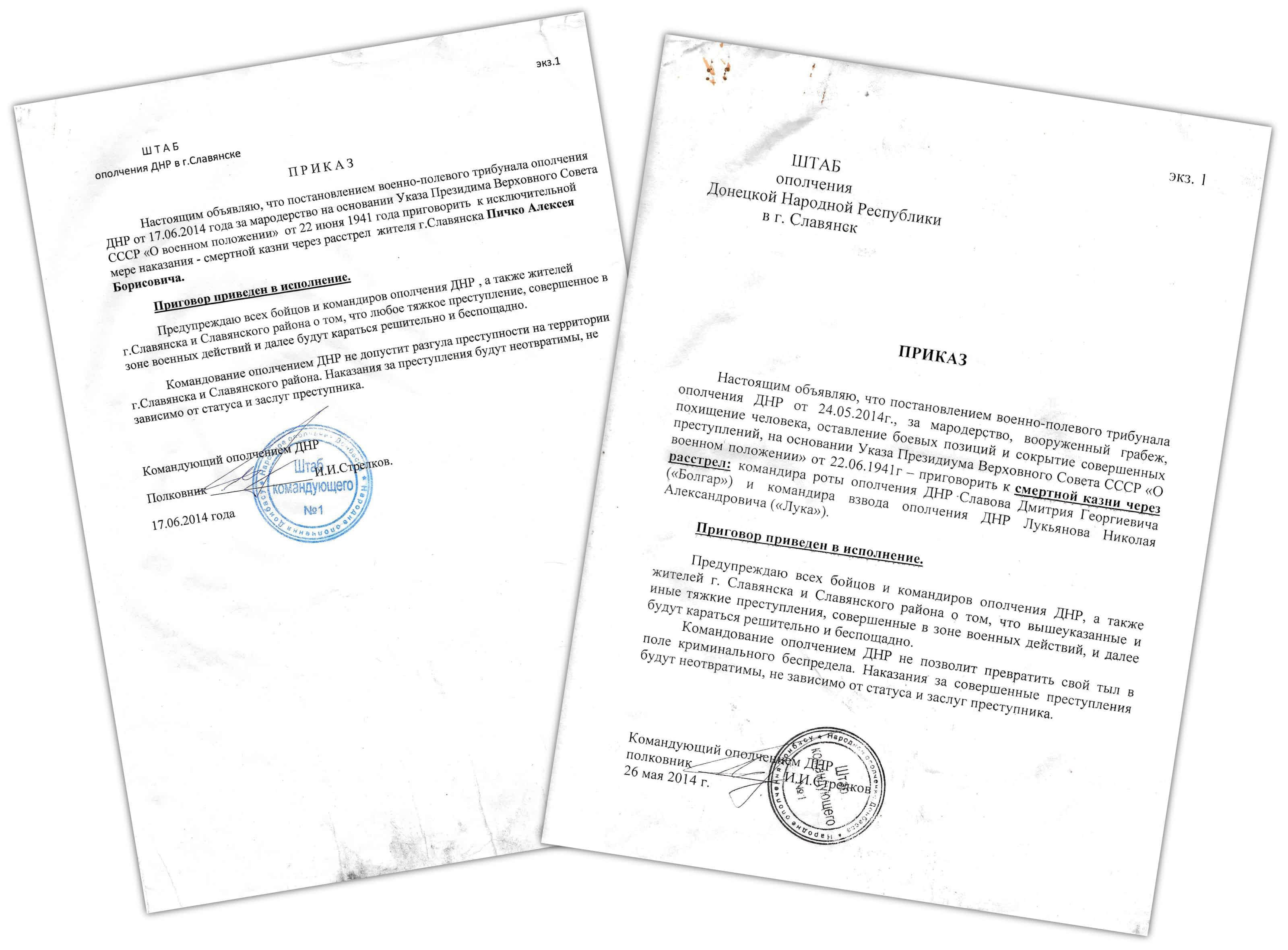 Слева – приказ о казни Алексея Пичко, подписанный Игорем Гиркиным, командующим поддерживаемыми Москвой сепаратистами, захватившими Славянск. Справа – подписанный Гиркиным приказ о казни Дмитрия Славова и Николая Лукьянова.