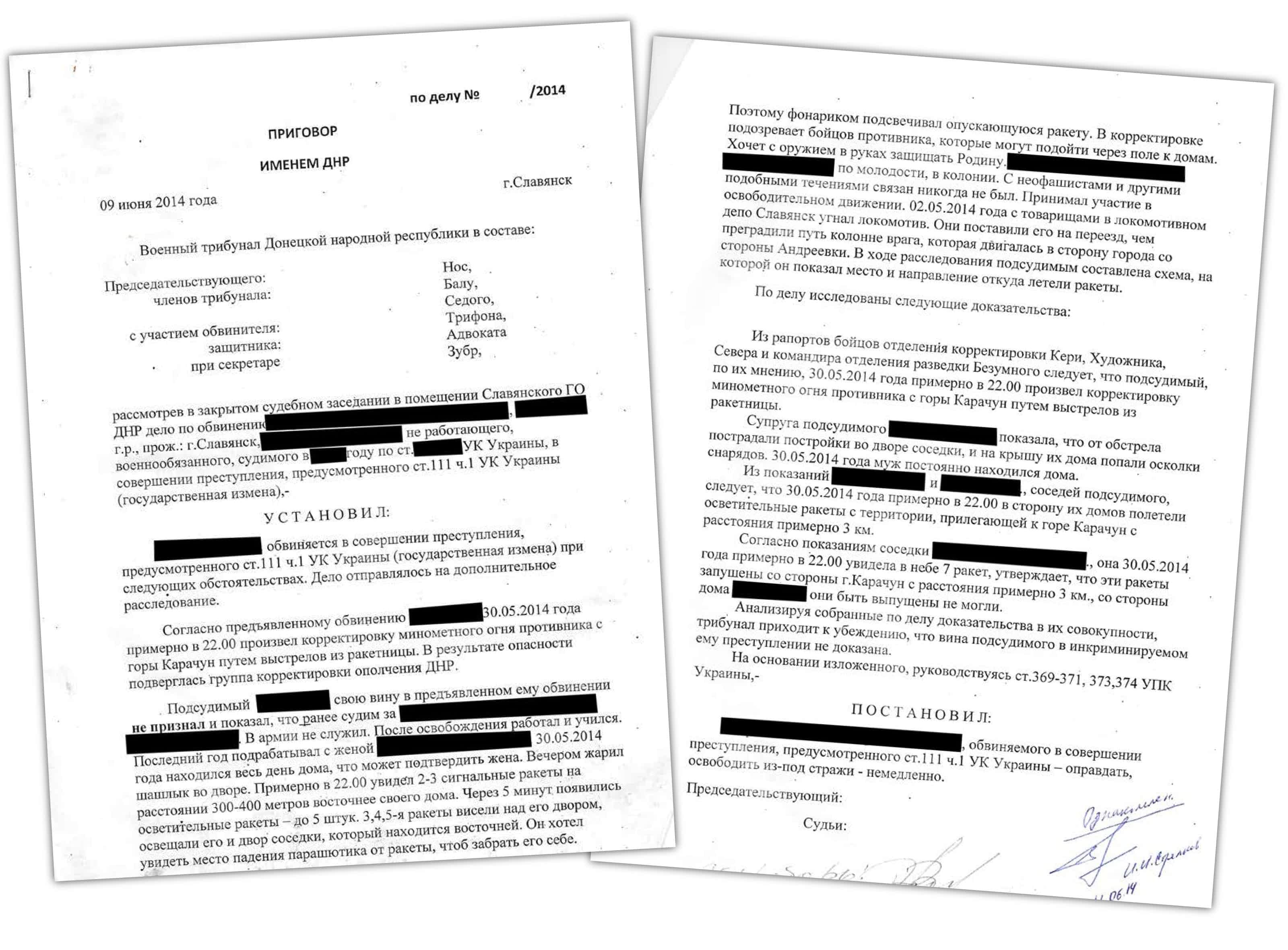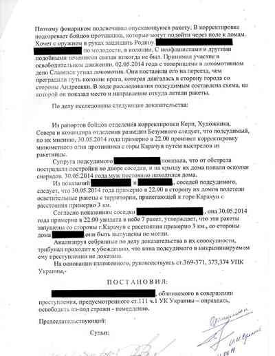 Среди обнаруженных документов – дело в отношении украинца, которому посчастливилось избежать расстрела. С него были сняты обвинения в измене за то, что он с помощью фонарика якобы корректировал огонь украинских вооруженных сил по позициям сепаратистов.