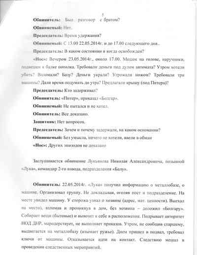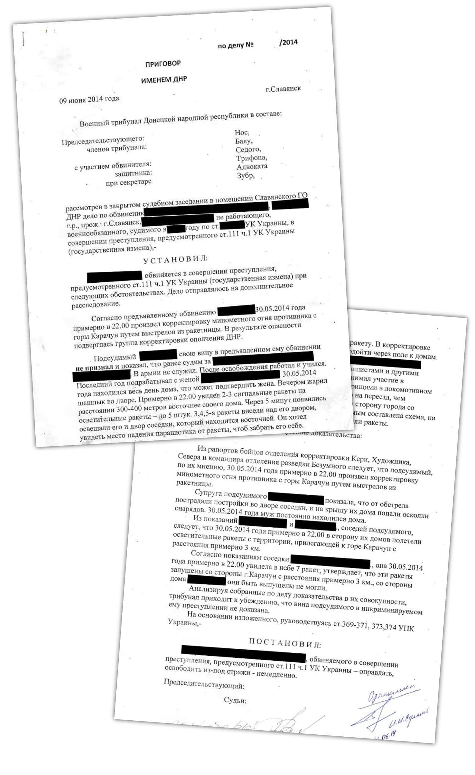 Подпись человека с позывным “Адвокат” встречается на многих страницах документов, найденных журналистом Радио Свобода в Славянске. Он был прокурором на заседании "трибунала", когда был вынесен приговор Пичко, защищал обвиняемого в измене, который был оправдан, опрашивал свидетелей и обвиняемых по делу Пичко и по делу оправданного “наводчика”, кроме того, осматривал места преступлений.
