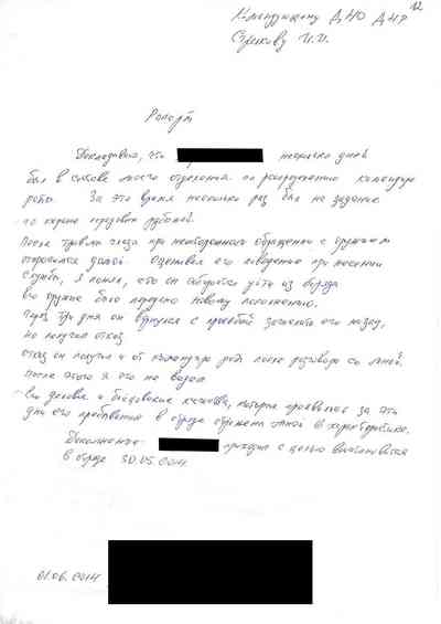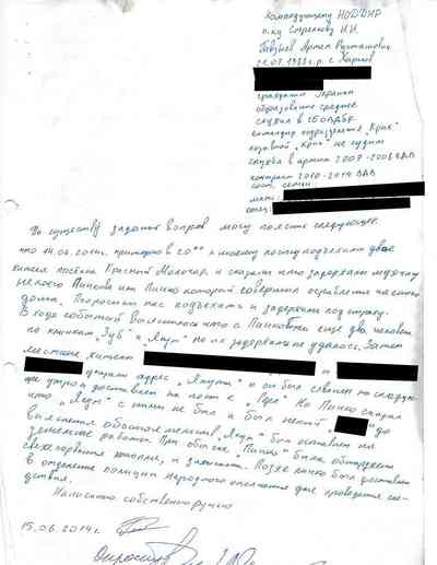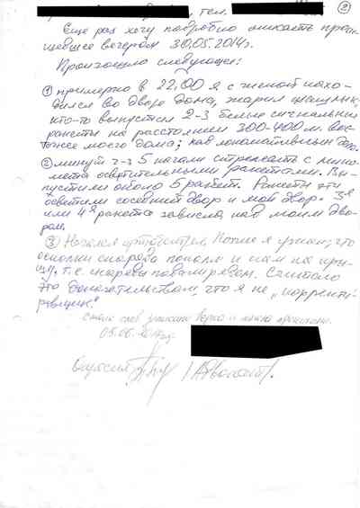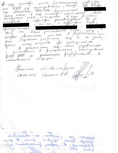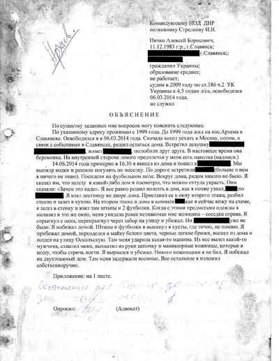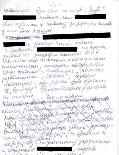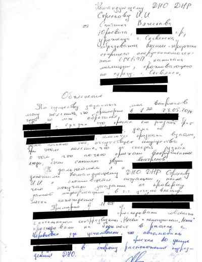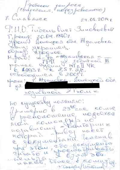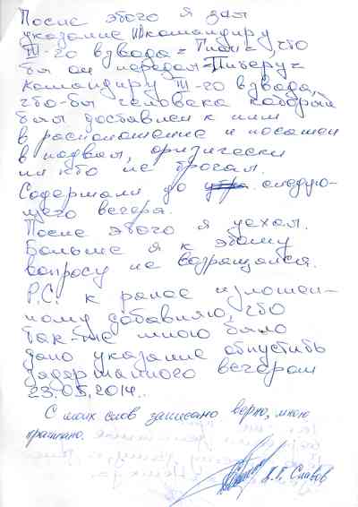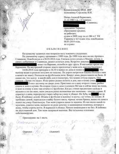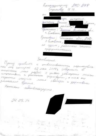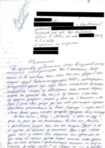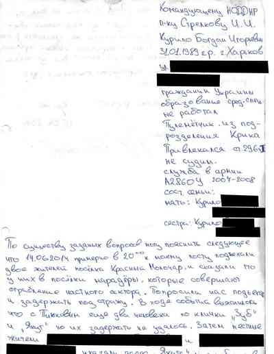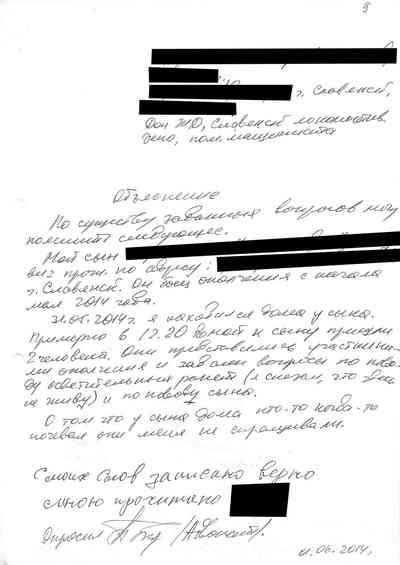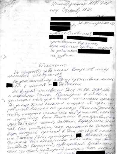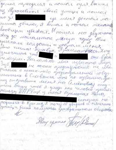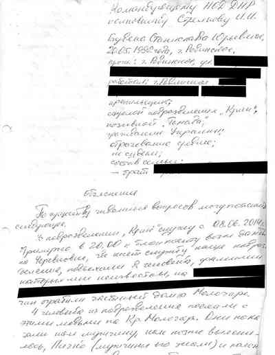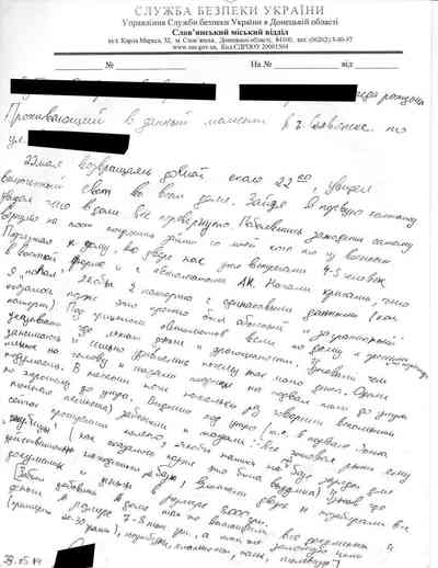 Среди документов – несколько "письменных показаний", которые жители Славянска дали под давлением людей Гиркина, как они рассказали Радио Свобода. Они говорили на условиях того, что их имена останутся не раскрыты, боясь преследования со стороны властей самопровозглашенной "ДНР" или украинских властей, которые могут обвинить их в пособничестве сепаратистам.
