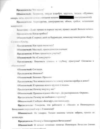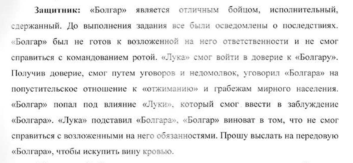 Защищая Пичко, он говорил, что предполагаемая кража – "преступление совершенно незначительное". Зюбанов считал, что "подобные действия нельзя квалифицировать как мародерство, так как мародерство – это похищение вещей солдат, убитых или раненных на поле боя, а субъектом преступления может быть военное лицо или ополченец".