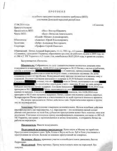 В этом интервью Трифонов рассказал и о том, как он отправился вслед за Стрелковым в Славянск, а также о своем участии "в захвате силовых структур Славянска и вооружения" в составе группы "отставного полковника военной контрразведки и очень грамотного человека" с позывным "Абвер" – именно его подпись стоит под смертным приговором Алексею Пичко.