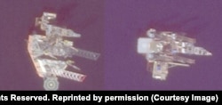 Самоподъемные буровые установки "Крым-1" (слева) и "Таврида" на спутниковых снимках, сделанных за месяц до украинского удара, 20 мая 2022 года: