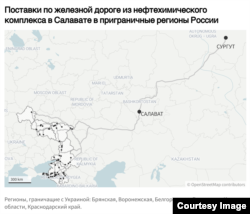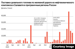 Как следует из анализа данных о перевозках дизельного топлива по железной дороге, полученных и проанализированных европейской неправительственной организацией Anti-Corruption Data Collective, поставки дизельного топлива с предприятия "Газпром нефтехим Салават" в российские регионы, граничащие с Украиной, увеличились после начала полномасштабной войны России против этой страны.